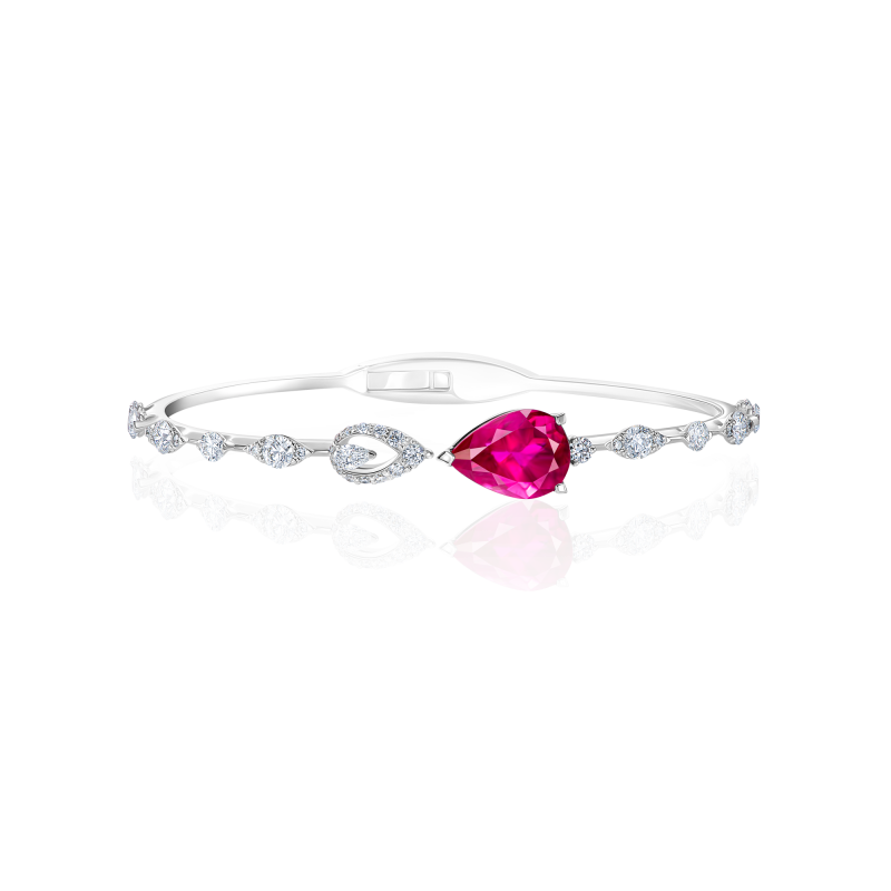 Pear-cut rubellite. Pear-cut and round-cut diamonds.