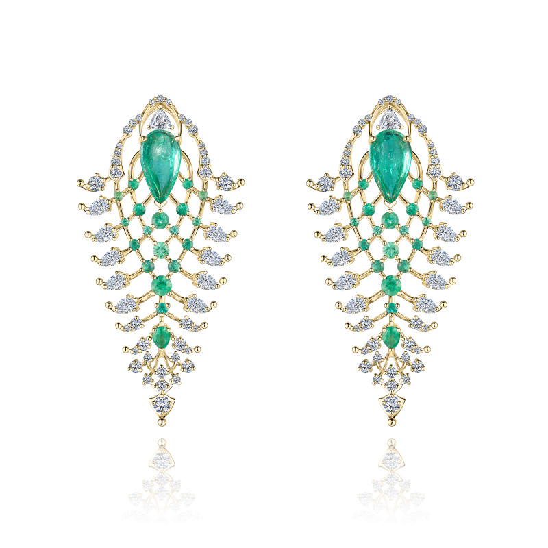 Pear-cut and round-cut emeralds. Pear-cut, trillion-cut and round-cut diamonds.