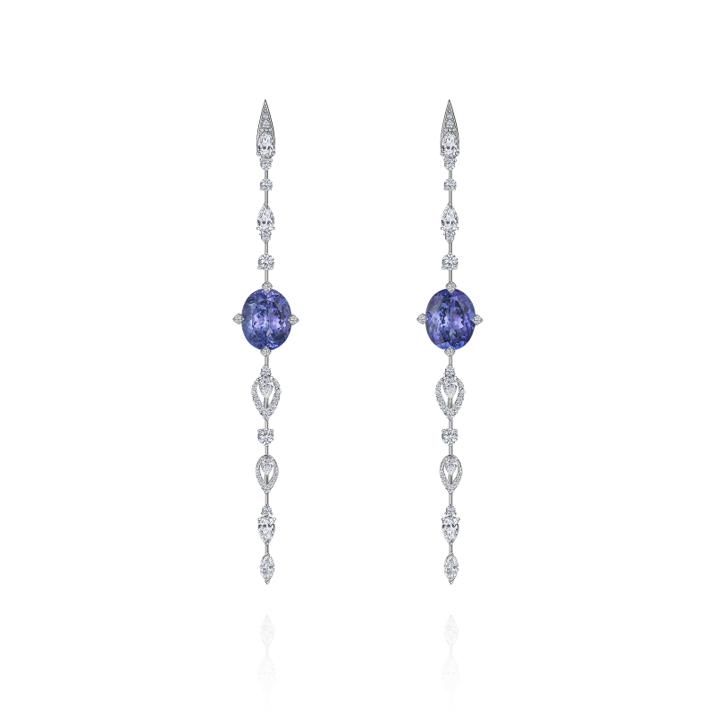 Tanzanites are oval-cut. Pear-cut, marquise and round-cut diamonds.